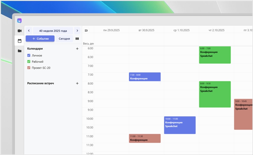 Сервис видеоконференций Speakchat представил календарь, который объединяет планирование и видеовстречи в одном пространстве. Пользователи могут за секунды создавать события, прикреплять необходимые материалы и автоматически приглашать участников из любых популярных календарей — Outlook, Apple Calendar, Google Calendar или Яндекс.Календаря. Календарь поддерживает повторяющиеся встречи, синхронизацию по протоколам CalDAV и iCal, импорт и экспорт событий (.ics), разные режимы отображения и быстрый поиск. Для команд доступны совместное использование календарей, публикация расписаний, назначение прав доступа и настройка рабочих часов.Календарь в Speakchat работает полностью автономно, без привязки к западным облачным сервисам.
