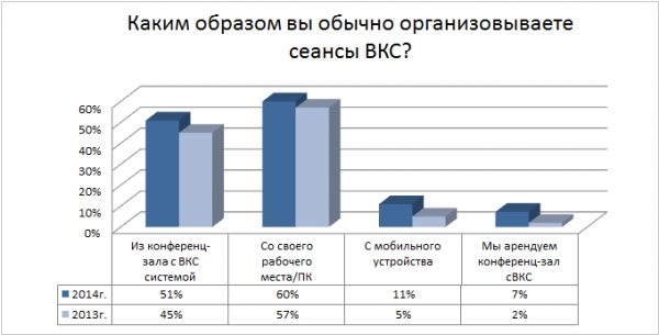 Компания TrueConf опубликовала результаты своего исследования рынка ВКС, проведенного на конференции "Видео+Конференция 2014". Они опросили 100 специалистов и директоров IT отделов предприятий и организаций РФ. По результатам опроса было установлено, большинство (60%) респондентов проводят видеоконференции со своего рабочего ПК, 51% - из переговорных комнат, около 7% - арендуют зал с ВКС системой. Более 10% респондентов пользуются видеоконференциями на своих мобильных терминалах, что в 2 раза больше, чем в 2013 году. Респонденты отметили, что готовы рассматривать облачные решения для видеосвязи как будущую альтернативу выделенным ВКС системам. В этот раз лишь 44% опрошенных очных участников предпочли владеть ВКС системой (по сравнению с 49% в 2013 г. и 70% в 2012г.), около 10% уже используют облачные сервисы, а 19% - совмещают оба типа развёртывания ВКС.